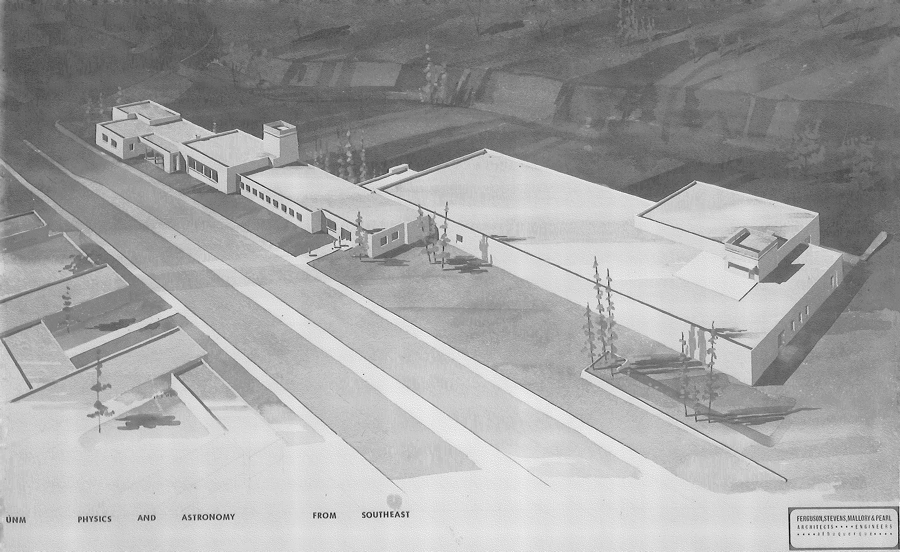A new physics building of 10,000 square feet was completed in the summer of 1952 at the northeast intersection of Lomas and Yale Boulevards at an estimated cost of $250,000. The location allowed convenient launching of balloon flights to study atmospheric ozone. The new building was used for advanced courses, upper division laboratories, and graduate research.