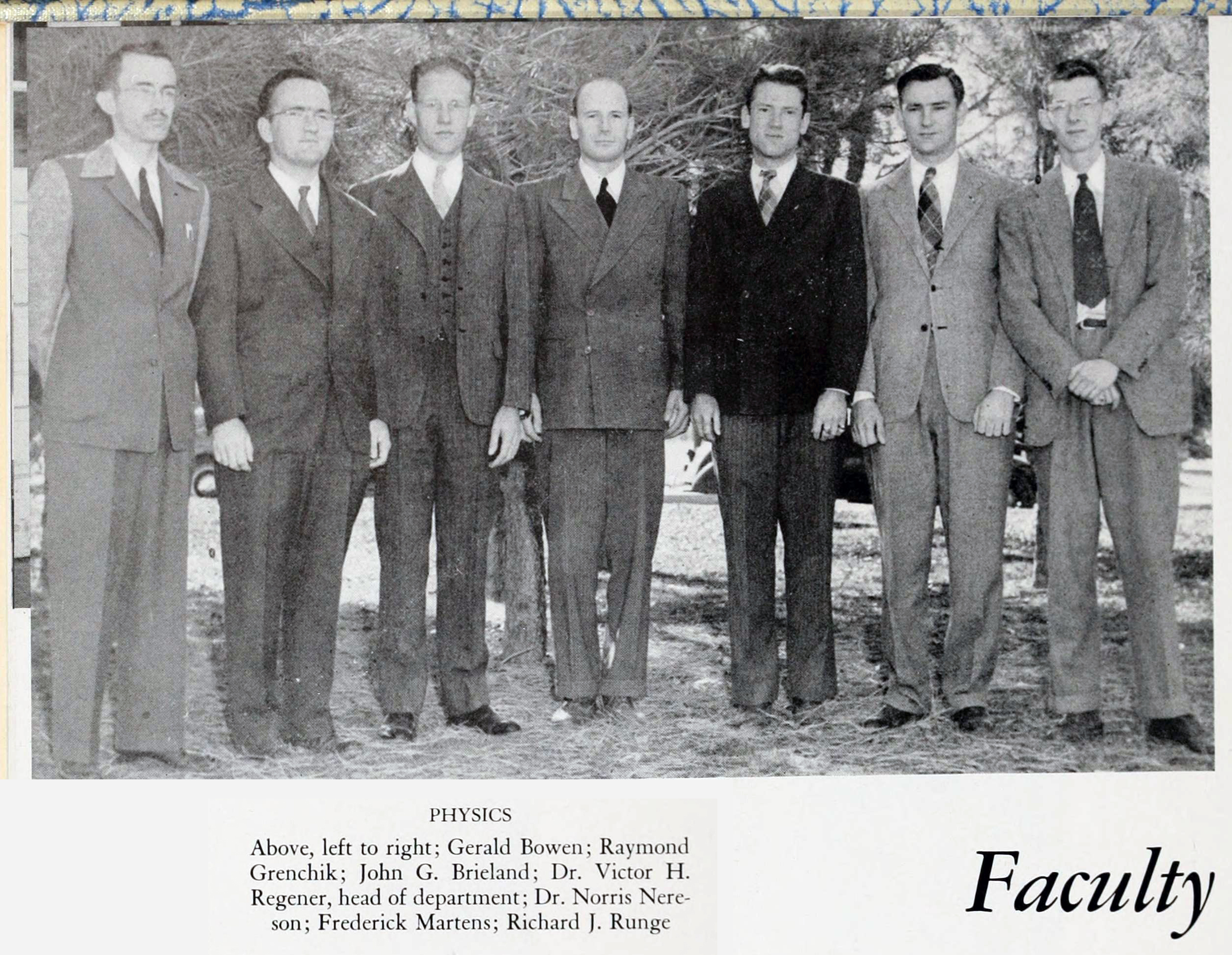 L-R: Faculty, Gerald Bowen, Raymond Grenchik, John Breiland, Department Head Victor Regener, Norris Nereson, Frederick Martens, Richard Runge, from the 1947 UNM Mirage